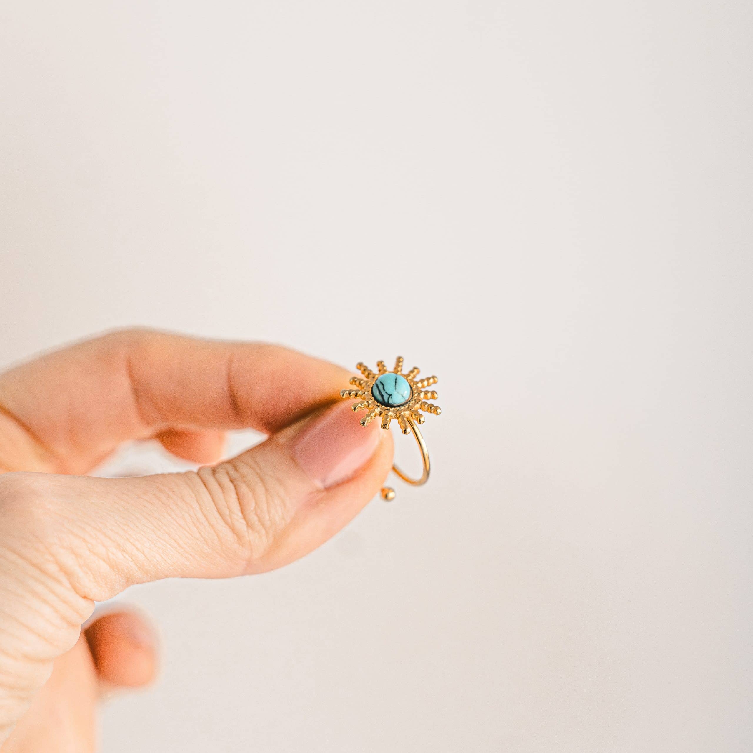 Złoty pierścionek w kształcie promiennego słońca z naturalnym turkusem to nie tylko piękna ozdoba, ale też energetyczny amulet chroniący i wzmacniający Twoją wewnętrzną siłę. W kulturach świata turkus uznawany jest za kamień ochrony, odwagi i harmonii. Pierścionek ma regulowaną obrączkę, co pozwala idealnie dopasować go do palca.