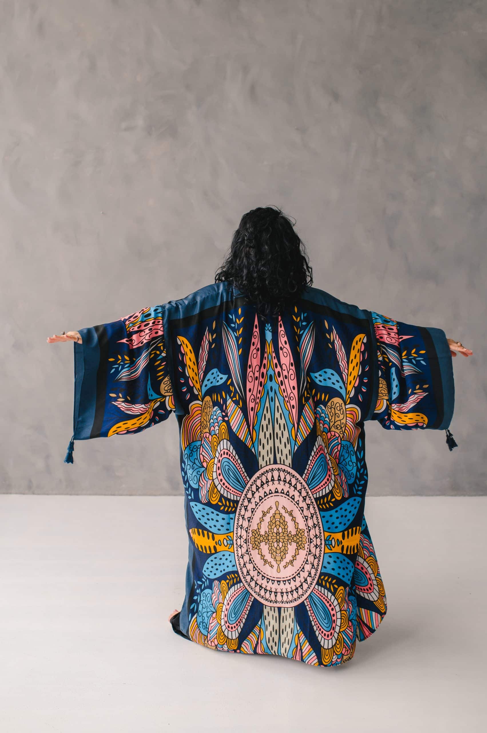 „Sunshine” to kimono o oversize’owym kroju, uszyte z miękkiej, oddychającej 100% wiskozy, która pięknie układa się na ciele i subtelnie faluje w ruchu.