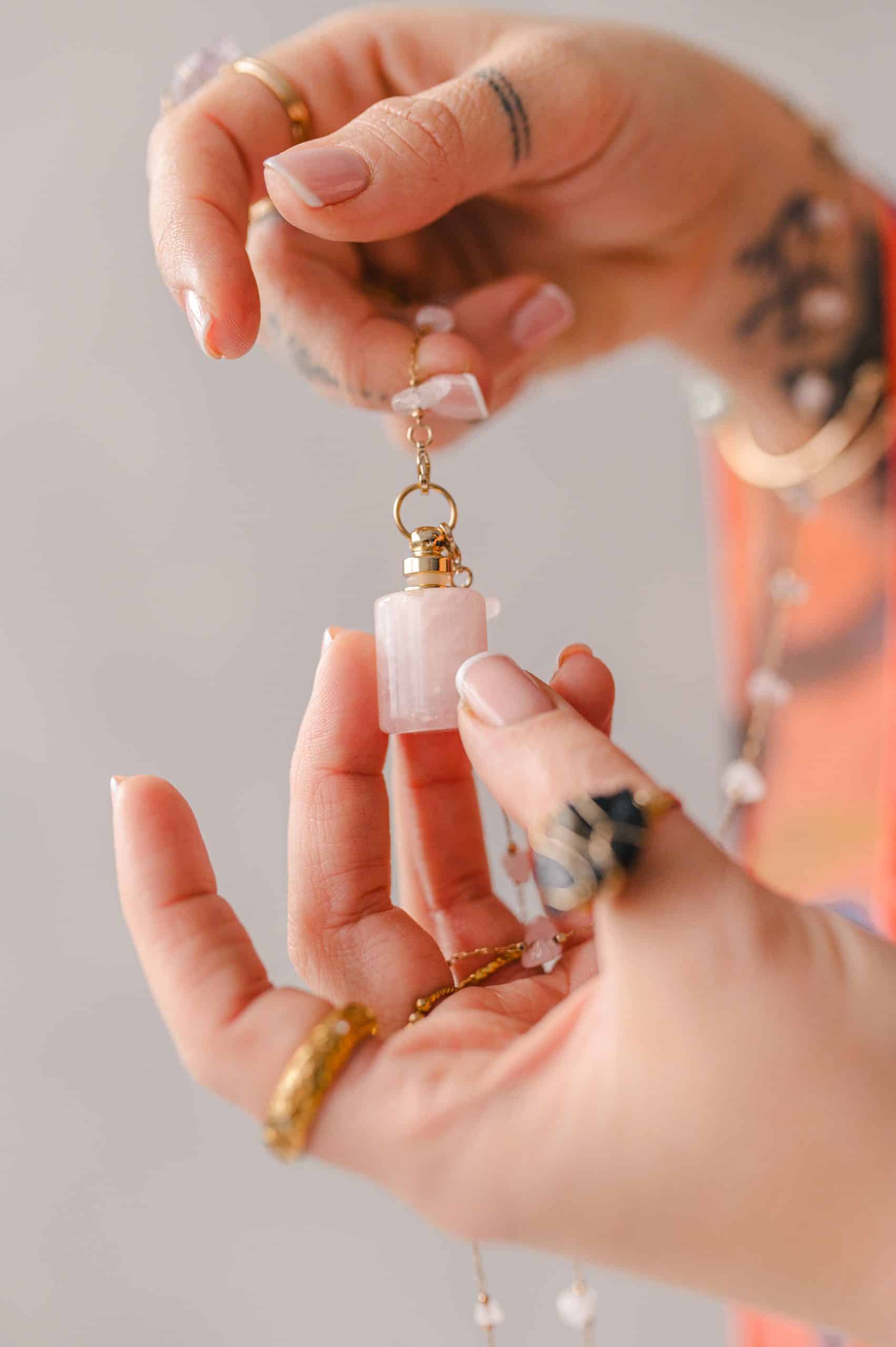 Różowa buteleczka zamocowana jest na delikatnym łańcuszku ozdobionym surowymi kamieniami. Dzięki możliwości regulacji długości możesz nosić go jako krótki naszyjnik typu choker lub długi w stylu boho.