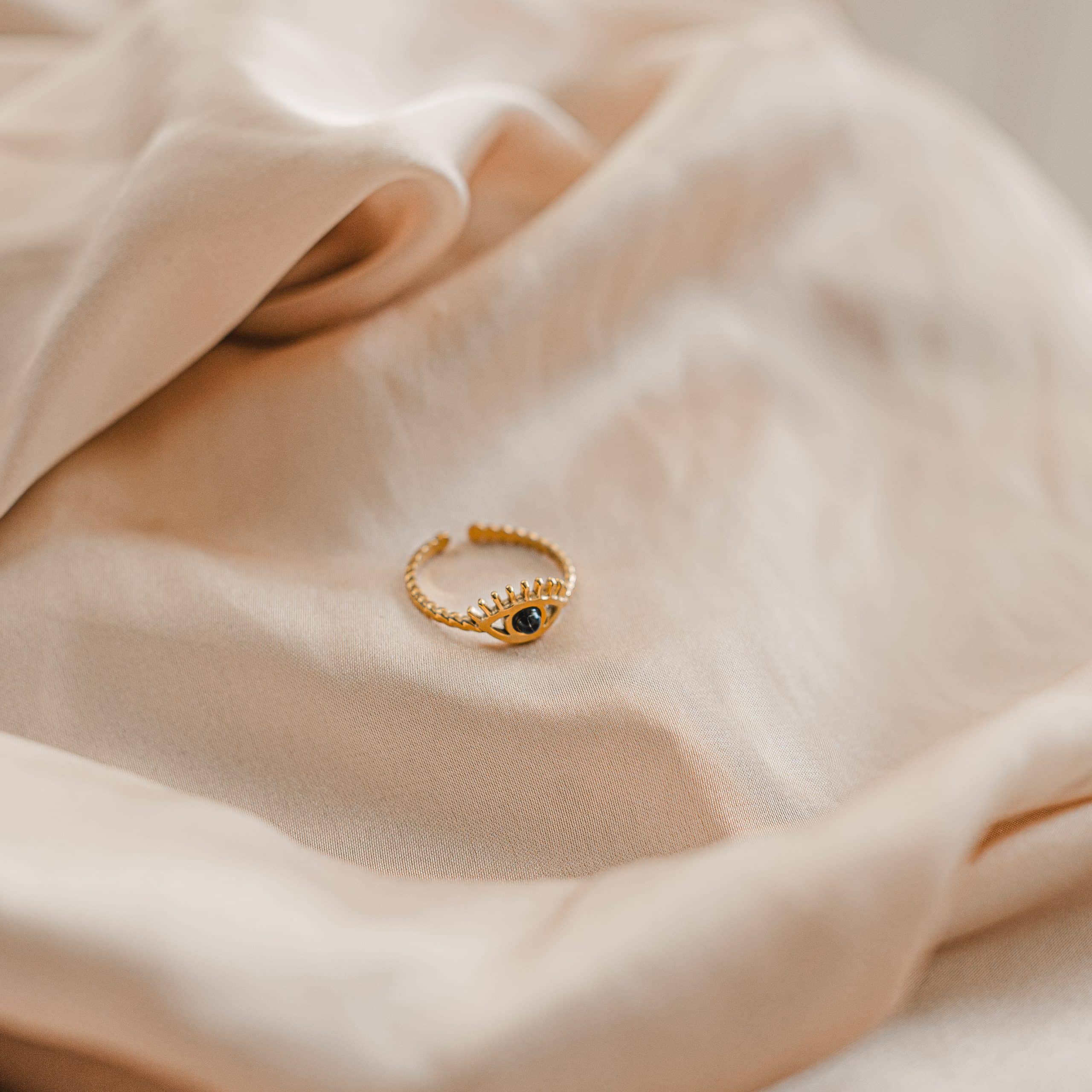 Wyjątkowy, regulowany pierścionek wykonany z pozłacanej stali chirurgicznej, który nie tylko przyciąga wzrok, ale również symbolicznie chroni i wzmacnia wewnętrzną intuicję. Centralny punkt stanowi oczko w kształcie oka z czarnym kamieniem, nawiązujące do starożytnego symbolu ochrony przed „złym okiem”.