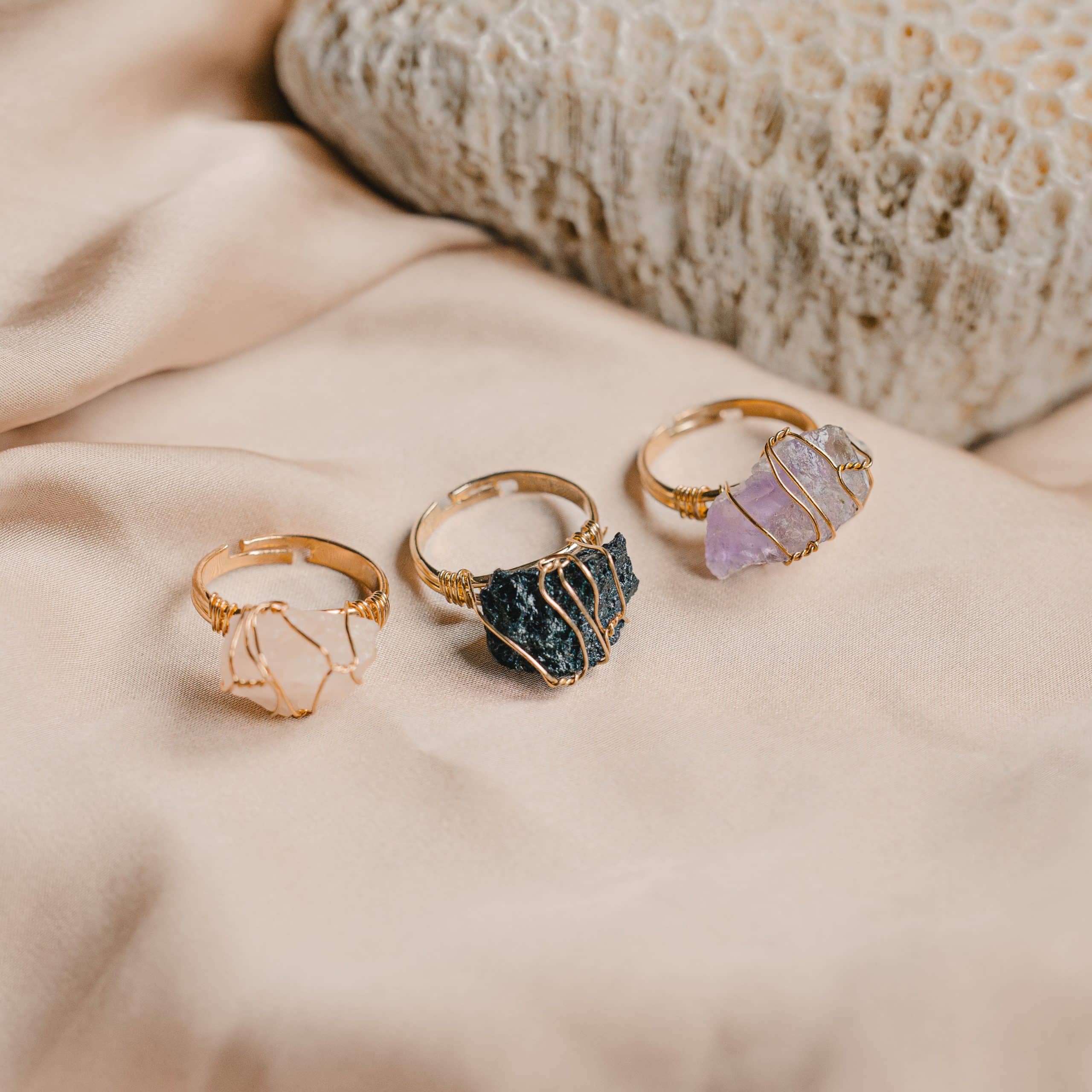 Wyjątkowe, ręcznie wykonane pierścionki z surowymi kamieniami naturalnymi, oprawione w minimalistyczną, pozłacaną obrączkę ze stali chirurgicznej. Każdy kamień ma swoją unikalną strukturę, moc i historię. Regulowana obrączka sprawia, że pierścionek dopasowuje się do każdego palca.
